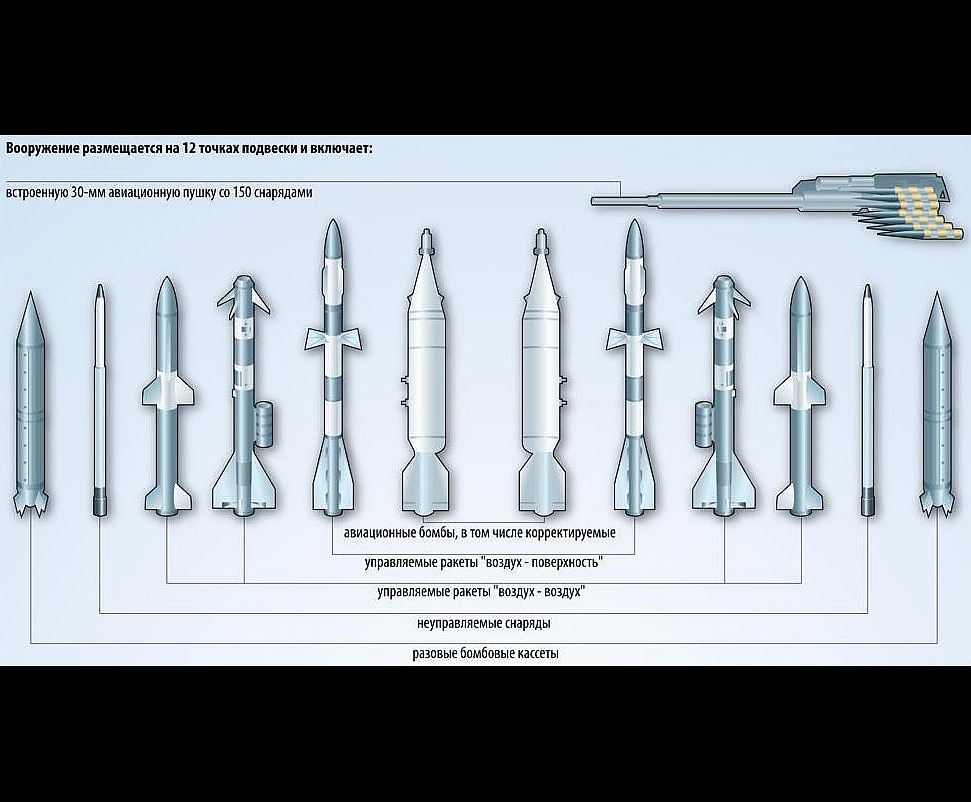 Фронтовой бомбардировщик Су-34 по боевым возможностям относится к поколению самолетов "4+". Независимо от времени суток и метеоусловий он способен эффективно поражать наземные, морские и воздушные цели в любом географическом районе с применением всей номенклатуры авиационных боеприпасов, в том числе высокоточных.