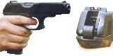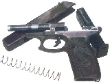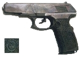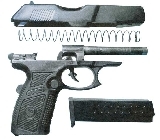 Пистолет армейский 6П35. В 1993 году ГРАУ уточняет требования к новому оружию. С этого момента принято решение о разработке армейского пистолета под новый отечественный 9x 19-мм патрон, получивший впоследствии индекс 7Н21. Этот патрон выполнен в габаритах стандартного пистолетного патрона НАТО 9x 19 мм .парабеллум., но при этом имеет большую мощность, пробиваемость и поражающее действие. По замыслу заказчика, это позволяет при необходимости использовать при стрельбе из новых отечественных пистолетов патроны НАТО. Кроме того, такое решение позволило бы поставлять новый пистолет на экспорт в страны, традиционно использующие натовские пистолетные патроны. В настоящее время наибольшее распространение в мире, получили две схемы автоматики пистолетов. Автоматика со свободным затвором и неподвижным стволом применяется, как правило, только в оружии под маломощные патроны. Пример этому . отечественный ПМ. Патроны большей мощности требуют использования схемы автоматики с подвижным стволом, сцепленным перед выстрелом с затвором. Практически, это почти все пистолеты под патрон .парабеллум. и еще более мощные. Такая конструкция при высокой надежности всей системы позволяет несколько снизить массу затвора и воздействие отдачи при стрельбе. Однако и такая схема имеет свои недостатки. Специалисты из ЦНИИточМаш, известного своими нетрадиционными решениями в разработке нового оружия, и здесь пошли своим путем. Конструкторы пистолета 6П35 ЦНИИточМаш, Петр Сердюков и Игорь Беляев подробно изучив зарубежные технологического упрощения пистолета за счет отказа от куркового ударного механизма и изготовления рамки пистолета из литьевой пластмассы . Однако такой путь не был признан целесообразным. Для создания самозарядного пистолета, имеющего небольшую массу, но под мощный патрон, был разработан затвор, состоящий из двух основных частей . Собственно корпуса затвора и боевой личинки, подпружиненных между собой. При этом боевая личинка имеет возможность продольного перемещения относительно корпуса затвора. Такое конструктивное решение, кстати, примененное в пистолетах впервые в мире, позволило разнести по времени один удар массивного затвора об ограничитель рамки в крайнем заднем положении на два последовательных удара деталей с меньшими массами. В предложенной схеме удар корпуса затвора по рамке наносится в момент, когда рука стрелка в результате первого удара личинки о выступ рамки начинает двигаться назад и, следовательно, стрелок испытывает меньшую нагрузку на руку. Это позволило также уменьшить массу и габариты пистолета. Все части пистолета имеют обтекаемые формы, что снижает возможность зацепления его за элементы снаряжения при вынимании. Рамка пистолета состоит и двух основных частей . металлической арматуры, которая является силовой конструкцией корпуса, и пластмассовой пистолетной рукоятки, выполненной заодно со спусковой скобой. В арматуру запрессован ствол с шестью правыми нарезами. Для изготовления рукоятки используется высокопрочная пластмасса.армамид (заменитель полиамида, производство которого, после распада СССР, осталось на Украине). Рукоятка имеет крупную насечку. Изготовление части рамки из пластмассы не только снижает трудозатраты на производство оружия, но и позволяет сделать пистолет более легким. Корпус