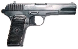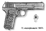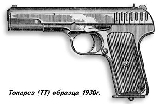 ТТ разработан в 1930 году Токаревым в Туле (отсюда название ТТ - Тульский Токарева). Автоматика работает на основе Браунинговской конструкции - короткий ход ствола, расцепление ствола с затвором при помощи подвижной серьги, запирание - выступами на стволе и внутренней поверхности затвора, основное отличие от оригинальной конструкции Д.Браунинга - выступы выполнены токарной обработкой по всему периметру ствола, а не фрезеруются на его верхней поверхности, что упрощает изготовление ствола. УСМ одинарного действия, курковый с открытым курком, выполнен в виде отдельного легкосьемного модуля для упрощения неполной сборки-разборки. Специальных предохранительных устройств пистолет не имеет, предусмотрена лишь постановка на предварительный взвод. Достоинства пистолета - простая и надежная конструкция и мощный высокоскоростной патрон, обеспечивающий сравнительно высокие точность и эффективную дальность стрельбы, а также проникающее действие пули. Меткость стрельбы из пистолета обеспечивается за счет низкого расположения оси канала ствола по отношению к рукоятке для уменьшения плеча отдачи, снижения скорости отдачи за счет применения массивного кожуха-затвора, а также за счет приближения центра тяжести оружия к рукоятке. Недостатки - возможность непроизвольного выстрела при изломе или износе упора предохранительного взвода при падении пистолета на твердую поверхность, а также недостаточная эргономика ркуоятки. В течение длительного времени (с начала 30х по 50е годы) ТТ являлся основным пистолетом Советской Армии, а после принятия на вооружение пистолета ПМ в 1951 году продолжал службу в различных силовых сруктурах. Пистолет копировался и клонировался в различных Соц. странах, включая Югослваию, Венгрию, Китай, Северную Корею, при этом зачастую пистолет оснащался ручным предохранителем, а также выпускался в калибре 9мм Пара. В Китае, Польше, Венгрии и в некоторых других странах ТТ выпускается и в настоящее время. Так, например, в Китае его выпустили под обозначением "Тип 51", в Корее - "Тип 68", в Венгрии на основе ТТ создали пистолет "Токагипт-58" под патрон 9 х 19 мм Пар., в Югославии выпустили копию ТТ с магазином на 9 патронов под наименованием М-57.