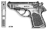 Предназначен главным образом для самозащиты и специальных операций. Состоит на вооружении высшего командного состава вооруженных сил, службы безопасности и МВД.Работа автоматики пистолета основана на принципе использования отдачи свободного затвора. Ударно-спусковой механизм куркового типа двойного действия, позволяет производить первый выстрел, при наличии патрона в патроннике, самовзводом.Отличительной особенностью пистолета является расположение головки флажка предохранителя над тыльной частью затвора рядом с курком, что позволяет одновременно с выключением предохранителя взводить курок.Отсутствие выступающих в стороны деталей, особенно щечек рукоятки, делают пистолет очень плоским (18 мм), что создает удобство для скрытого ношения.Магазин пистолета имеет на боковых стенках корпуса широкие окна для размещения выступов подавателя патронов и облегчения его снаряжения.Прицельное приспособление открытого типа.Для пистолета разработан специальный 5,45-мм патрон небольшой мощности. В результате получилось удобное малогабаритное оружие с высокой кучностью боя. Поскольку пробивное и останавливающее действие пули нового патрона явно недостаточно, в бою такое оружие малоприменимо.