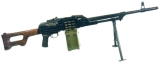 Пулемет Калашникова. Принцип работы автоматики аналогичен системе АК. Однако пулемет ПК имеет ряд отличий. Для стрельбы из ПК применяется мощный винтовочный патрон обр. 1908/30 гг., гильза которого имеет закраину (фланец). Питание ленточное, переводчик режимов огня отсутствует, предохранитель флажковый, блокирует шептало, ударный механизм ударниковый.Пулемет сочетает высокие маневренные свойства ручного пулемета и силу огня станкового пулемета. Пулемет ПК на сошках используется в качестве ручного, а на станке он применяется как станковый пулемет (ПКС). Радикально усовершенствована технология производства пулемета - штампосварная ствольная коробка с вклепанным вкладышем и т. д.