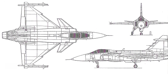 Страна-разработчик: Швеция Тип: многоцелевой истребитель Вооружение: одна 27-мм пушка «Маузер» ВК27; максимальная боевая нагрузка 6500 кг, в том числе УР класса воздух-воздух Rb 74 (AIM-9L), Rb 99 (AIM-120), IRIS-T (с 2004 г.), УР класса воздух-поверхность Rb 75 («Мейврик»; ПКР Rbs 15, противотанковые кассетные боеприпасы DWS 39, КР KEPD 150 «Таурус»; самолеты «Грипен» для ЮАР могут нести УР класса воздух-воздух малой дальности V-3E «A-Дартер» и УР большой дальности с активной радиолокационной ГСН «А-Дартер» Двигатель: один ТРДЦФ Вольво Аэро RM-12 тягой 5510 кгс и 8220 кгс на форсажном режиме ЛТХ: максимальное число М=1,8; практический потолок 20000 м; дальность полета с ПТБ - 3000 км Масса: пустого 6620 кг; максимальная взлетная 13000 кг Размеры: размах крыла 8,4 м; длина 14,1 м; высота 4,5 м |