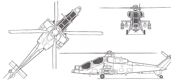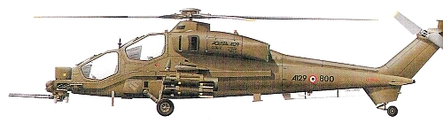 Страна-разработчик: Италия Тип: двухместный легкий противотанковые или разведывательный вертолет Вооружение: максимальная боевая нагрузка 1200 кг, в том числе до 8 ПТУР «Тоу» 2А, блоки с 52 PC калибром 70 мм или PC «Медуза» калибром 81мм, контейнеры с 12,7-мм пулеметами на подкрыльных пилонах Двигатели: два ГТД Пьяджо/Роллс-Ройс «Джем» 2-2 Мк. 1004D мощностью по 880 л.с.