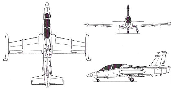 Вооружение: бомбовая нагрузка до 1800 кг на внешних узлах подвески, в том числе бомбы Мк.80 калибром 454 кг, пушечные или пулеметные контейнеры, контейнеры PC различных калибров, УР класса воздух-воздух Матра R550 «Мажик» 2 или Рейтеон AIM-9L/P «Сайдуиндер» Двигатель: один ТРД Роллс-Ройс «Вайпер» Мк.680-43 тягой 2000 кгс, выпускавшийся по лицензии фирмой «Пьяджо»
