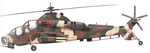 Страна-разработчик: ЮАР Тип: двухместный боевой вертолет Вооружение: турельная установка под носовой частью фюзеляжа с одной 20-мм пушкой Армскор GA-1 «Раттлер» или 30-мм пушкой DEFA 55; на четырех пилонах под крылом возможна подвеска вооружения массой до 2030 кг, в том числе блоки с 18 PC калибром 68-мм, пусковые устройства с четырьмя ПТУР Атлас «Свифт» с лазерным наведением; на концах крыла могут устанавливаться УР класса воздух-воздух Двигатели: два ГТД Атлас «Топаз» (вариант французского двигателя Турбоме- ка «Макила» 1А2) мощностью по 825 л.с. ЛТХ: крейсерская скорость 280 км/ч; дальность полета 940 км Массы: пустого 5910 кг; максимальная взлетная 8750 кг