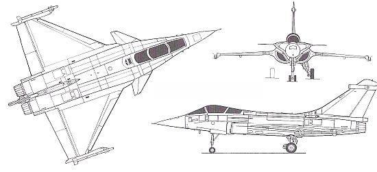 Вооружение: одна 30-мм пушка GIAT/DEFA М791 В; максимальная боевая нагрузка 9500 кг; основное вооружение состоит из восьми УР класса воздух-воздух «Мика», одной тактической КР с ядерной боеголовкой или двух КР «Апаш» или SCALP Двигатели: два ТРДДФ SNECMA М88-2 тягой по 4970 кге или 7445 кге на форсажном режиме.