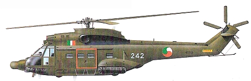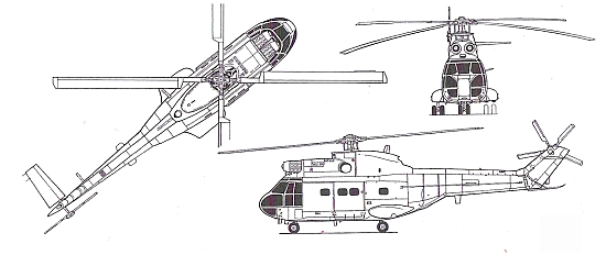 Страна-разработчик: Франция Тип: средний многоцелевой вертолет; экипаж 2-3 человека Платная нагрузка: в кабине перевозка до 21 десантника, максимальная нагрузка на внешней подвеске 4500 кг Двигатели: два ГТД Турбомека «Макила» 1А1 мощностью по 1880 л.с. ЛТХ: максимальная крейсерская скорость у земли 260 км/ч; максимальная скороподъемность у земли 7 м/с; практический потолок 4100 м; дальность полета со стандартным запасом топлива 620 км, с двумя ПТБ и одним дополнительным внутренним баком - 980 км Массы: пустого 4330 кг; максимальная взлетная с грузом в кабине 9000 кг; максимальная взлетная с грузом на внешней подвеске 9350 кг Размеры: диаметр несущего винта
