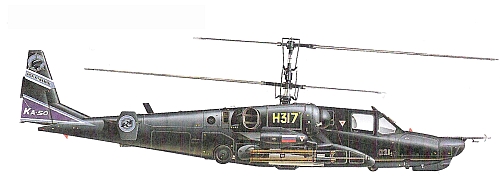 17 июня 1982 г., а в октябре 1986 г. вертолет под обозначением Ка-50 был выбран для серийного производства. Основным оружием вертолета являются 16 сверхзвуковых ПТУР 9М120 «Вихрь» (обозначение НАТО - АТ-9 «Spiral»), установленных под крылом в пусковых контейнерах. Автоматическая пушка имеет переменный темп стрельбы; ее боезапас располагается в двух патронных ящиках. Живучесть повышена благодаря использованию тепловых экранов на выхлопных соплах ГТД, многослойному бронированию кабины и использованию тепловых ловушек и дипольных отражателей. В случае необходимости летчик может покинуть вертолет с помощью катапультируемого кресла К-37 (перед катапультированием лопасти винтов отстреливаются). По экономическим причинам серийный выпуск вертолетов Ка-50 ограничился постройкой нескольких экземпляров. Фирме «Камов» пришлось дорабатывать вертолет, для обеспечения ночных полетов, где предпочтение было отдано вертолету Ми-28, который благодаря экипажу из двух человек лучше справлялся с поставленными задачами. В результате был разработан вариант Ка-50Н, первый полет которого состоялся в 1997 г, На основе вертолета Ка-50 был создан двухместный вертолет Ка-52 «Аллигатор» (обозначение НАТО - «Hokum-В»), который может использоваться для выполнения боевых задач днем и ночью, а также в качестве учебного. Летчики в кабине сидят рядом и при необходимости могут катапультироваться. Вертолет Ка-52 оснащен более мощными двигателями ТВЗ-117 и миллиметровой РЛС.