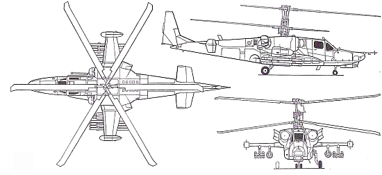 Страна-разработчик: Россия Тип: одноместный боевой вертолет для непосредственной поддержки войск, борьбы с танками и вертолетами противника Вооружение: одна одноствольная 30-мм пушка А242 в обтекателе с правого борта; боевая нагрузка до 3000 кг, в том числе ПТУР с лазерным наведением 9М120 «Вихрь» и «Вихрь М», блоки с PC, бомбы, кассетное оружие, а также УР класса воздух-воздух Р-73 или «Игла-В» Двигатели: два ГТД ТВЗ-117ВК мощностью по 2195 л.с.