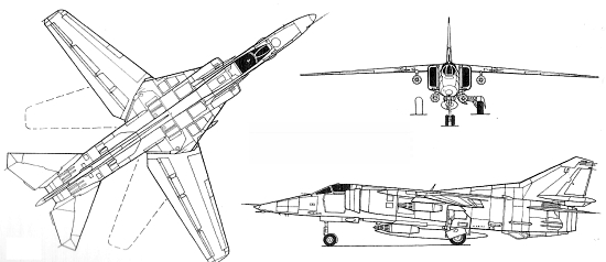 самолет Вооружение: одна шестиствольная 30-мм пушка ГШ-6-30; максимальная боевая нагрузка 4000 кг; в состав вооружения могут входить тактические ядерные бомбы, УР класса воздух-поверхность Х-23 (обозначение НАТО - AS-7 «Kerry»), Х-25МЛ (AS-10 «Кагеп») и Х-29Л/Т (AS-14 «Kedge»), противорадиолокационные ракеты Х-25МП (AS-12 «Kegler») и Х-28 (AS-9 «Kyle»), обычные авиабомбы серии ФАБ и бомбы с тормозными устройствами Двигатель: один ТРДФ Р-29Б-300 5280 кгс и 9240 кгс на форсажном режиме ЛТХ; максимальная скорость на высоте 8000 м - 1885 км/ч (М=1,7); практический потолок 14000 м; боевой радиус в полете на малой высоте с двумя ракетами Х-29 и тремя ПТБ - 450 км Массы: пустого 11910 кг; максимальная взлетная 20670 кг Размеры; размах крыла при минимальном угле стреловидности