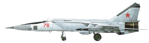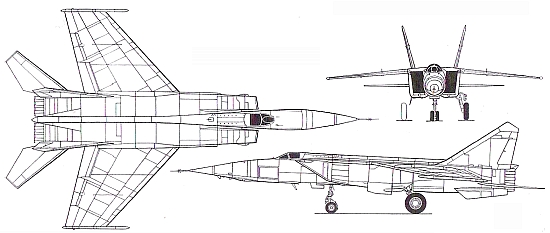 Страна-разработчик: СССР Тип: одноместный истребитель-перехватчик Вооружение: максимальная боевая нагрузка 4000 кг; в стандартный вариант вооружения для выполнения перехвата входят две УР класса воздух-воздух Р-40Р или Р-46РД с полуактивной радиолокационной ГСН и две ракеты Р-40Т или Р-46ТД с тепловой ГСН, или две УР средней дальности Р-23Р/Т и две Р-24Р/Т с полуактивной радиолокационной или тепловой ГСН, или четыре ракеты ближнего боя Р-60 или Р-60М с тепловой ГСН Двигатели: дваТРДФ Р-15БД-300 тягой по 8800 кгс и 11210 кгс на форсажном режиме ЛТХ: максимальная скорость на высоте 13000 м - 3000 км/ч (М=2,82); время набора высоты 20000 м - 8 мин 54 с; практический потолок 20700 м; дальность полета на дозвуковом режиме 1730 км; на сверхзвуковом режиме со стандартным запасом топлива - 1250 км; продолжительность полета 2 ч 5 мин. Массы: максимальная взлетная 36720 кг (с максимальным запасом топлива во внутренних баках) и 41090 кг (с подфюзеляжным ПТБ)