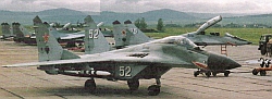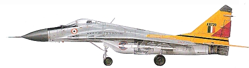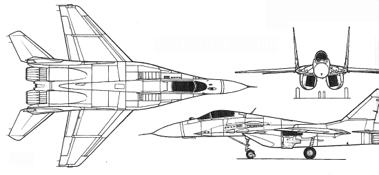 Вооружение: одна встроенная 30-мм пушка ГШ-301 с боезапасом 150 снарядов; максимальная боевая нагрузка 2000 кг; в состав вооружения в варианте перехватчика входят две УР класса воз- дух-воздух средней дальности Р-27Р/Р1 или Р-27Т/Г1 с полуашвной радиолокационной и тепловой ГСН, соответственно, и четыре ракеты ближнего боя Р-60М/М1 или Р-73РМ2Д с тепловыми ГСН Двигатели: два ТРДЦФ РД-33 тягой по 5045 кгс и 8310 кгс на форсажном режиме ЛТХ: максимальная скорость на высоте 11000 м - 2445 км/ч; у земли - 1500 км/ч; максимальная скороподъемность у земли 330 м/с; практический потолок 17000 м; перегоночная дальность полета с тремя ПТБ - 2100 км; дальность полета безПТБ- 1500 кмМассы: пустого 10900 кг; нормальная взлетная в варианте перехватчика 15240 кг; максимальная взлетная в ударном варианте 18500 кг Размеры: размах крыла 11,36 м; дл|| 17,32 м; высота 4,73 м |