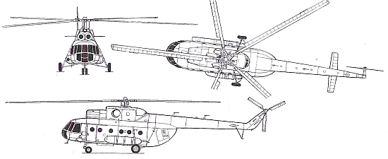 Страна-разработчик: СССР Тип: средний многоцелевой вертолет Нагрузка: максимальная платная нагрузка, перевозимая в кабине, - 4000 кг; перевозимая на внешней подвеске - 3000 кг; число десантников - 24 Вооружение (транспортно-бое- вой вариант): пулеметы калибром 7,62 и 12,7 мм, блоки с PC калибром 57 и 80 мм, бомбы калибром 250 кг; предусмотрена установка ПТУР 9М17П «Скорпион», 9М114 «Штурм» и 9М120 «Вихрь», а также УР класса воздух-воздух «Игла-В» Двигатели: два ГТДТВ2-117А мощностью по 1680 л.с.
