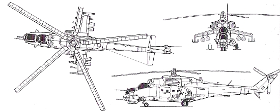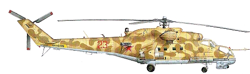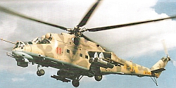 Вертолет Ми-24 (обозначение НАТО - «Hind») - один из самых известных с мире боевых вертолетов: он состоит на вооружении армии свыше 35 стран. Вертолет был создан на основе конструкции транспортно-десантного вертолета Ми-8. Первый опытный экземпляр В-24 поднялся в воздух в 1969 г. Первоначально выпускался вариант Ми-24А («Hind-A/B/С»), оба члена экипажа которого сидели тандемом под общим фонарем. Затем был налажен выпуск модификации Ми-24Д («Hind-D»), которая экспортировалась под обозначением Ми-25. На нем усилили бронирование, экипаж размещался тандемом в отдельных кабинах, под носовой частью фюзеляжа была установлена пушечная р/рель. В 1976-1978 гг. в эксплуатацию поступал вертолет Ми-24В («Hind-Е») с более мощными двигателями. Под обозначением Ми-35 он поставлялся на экспорт. Вооружение вертолета было усилено: он мог нести ПТУР 9М114 «Штурм» (обозначение НАТО - АТ-6 «Spiral»).