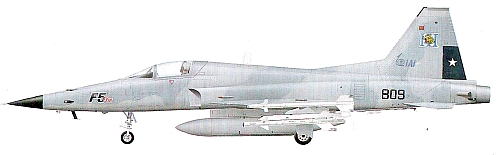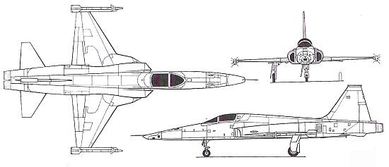 Страна-разработчик: США Тип: одноместный легкий тактический истребитель Вооружение: одна встроенная 20-мм пушка Форд М39А2; максимальная боевая нагрузка 3175 кг, в том числе УР класса воздух-воздух AIM-9P, «Питон» 3/4; на самолетах F-5E ВВС Швейцарии могут устанавливаться УР класса воз- дух-поверхность «Мейврик», Таиланда - контейнеры GPU-5 с 30-мм пушками, Саудовской Аравии - противорадиоло- кационные УР AGM-45 «Шрайк», КАБ GBU-10/12, кассетные бомбы «Рокай» и УР класса воздух-воздух R550 «Мажик» Двигатели: два ТРДФ Дженерал Электрик J85-GE-21В тягой по 1590 кгс и 2270 кгс на форсажном режиме ЛТХ: максимальная скорость 1700 км/ч; скороподъемность 174 м/с; практический потолок 15550 м; боевой радиус с максимальным запасом топлива и двумя УР AIM-9 - 1405 км Масса: пустого 4350 кг; максимальная взлетная 11190 кг Размеры: размах крыла без ракет на законцовках 8,13 м; длина со штангой ПВД 14,45 м; высота
