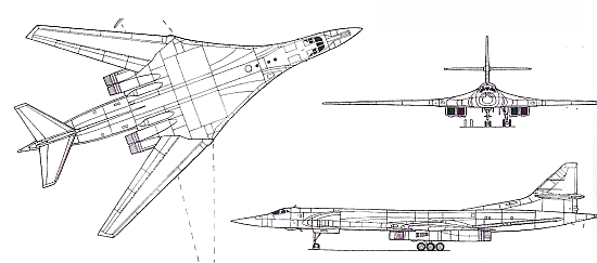 Страна-разработчик: СССР Тип: стратегический бомбардировщик Вооружение: максимальная боевая нагрузка 40000 кг; имеются два тандемно расположенных бомбоот- сека, оснащенных вращающейся пусковой установкой, рассчитанной на 6 стратегических КР Х-55 или Х-55СМ, или 12 УР класса воздух- поверхность Х-15П, или обычные бомбы; в дальнейшем планируется установка новых КР большой дальности X-101 с обычными боеголовками для нанесения точечных ударов
